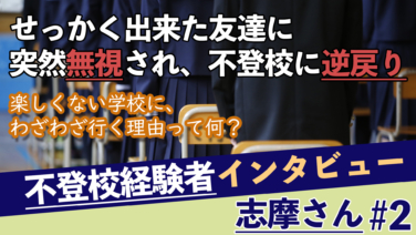 今回は、中学2年生から卒業まで不登校になった志摩さん(仮名)のインタビュー記事を掲載いたします。部活と友人のいじめがキッカケで不登校になった志摩さん。その後、苦...